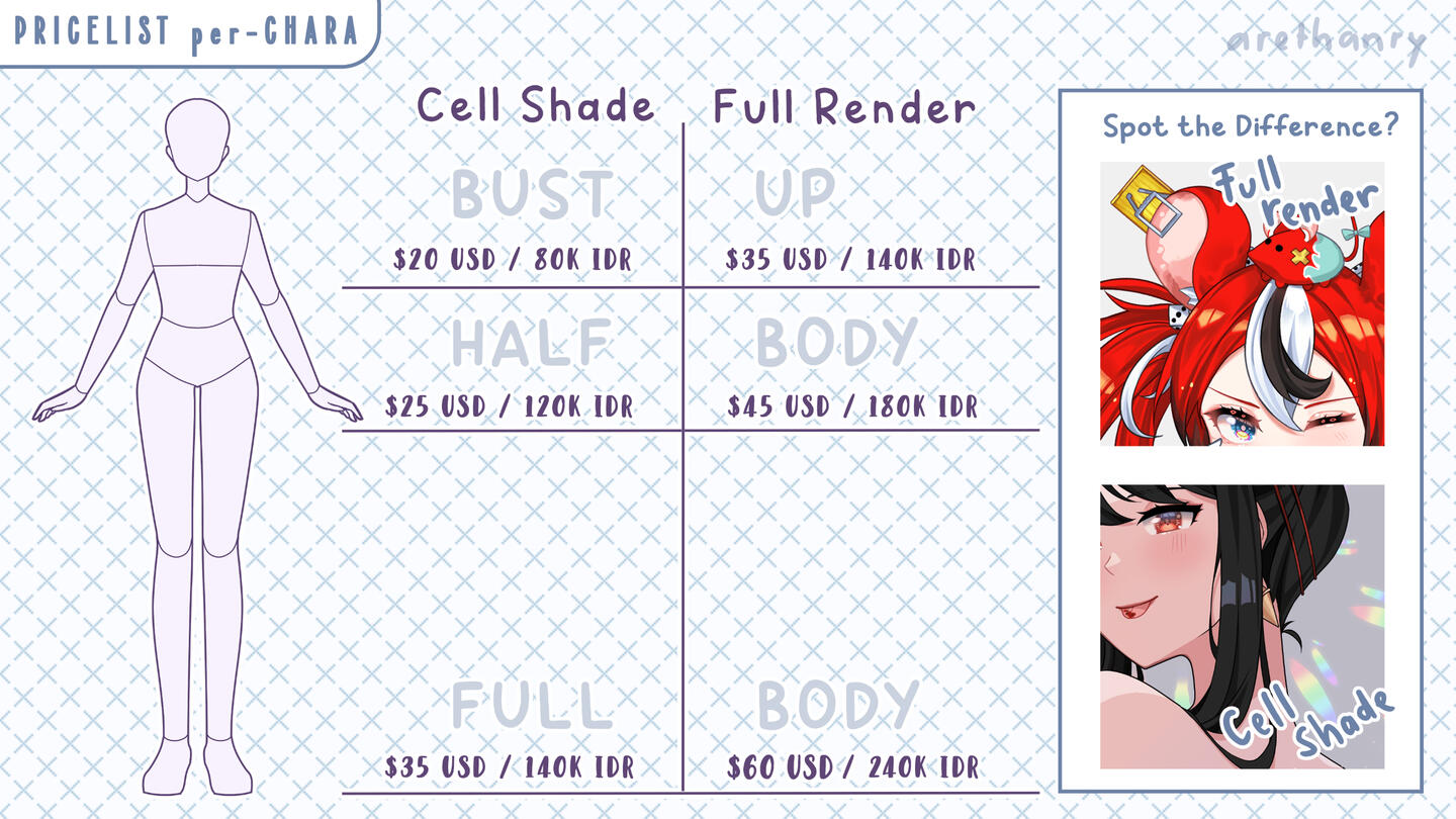 - Detailed chara ( ex: Genshin Chara, heavy patterns, etc ) will charge $10-40 USD / 40-160k IDR